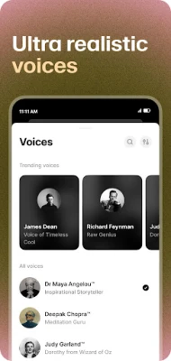 ElevenLabs is synonymous with quality, and that's why we're bringing together industry icons to make your reading journey even more enjoyable. Explore the latest titles of our expansive collection of indie and literary classic audiobooks, then listen in a voice of your choice. From Burt Reynolds, Sir Laurence Olivier, Judy Garland, Jerry Garcia and James Dean to Dr. Maya Angelou, Deepak Chopra and Dr. Richard Feynman, experience legendary voices from television, film, literature and beyond and start enjoying the unforgettable magic of iconic voices with AI narration.