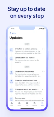 - Monitor the building progress: Follow timeline and progress, and receive updates and practical information about the project